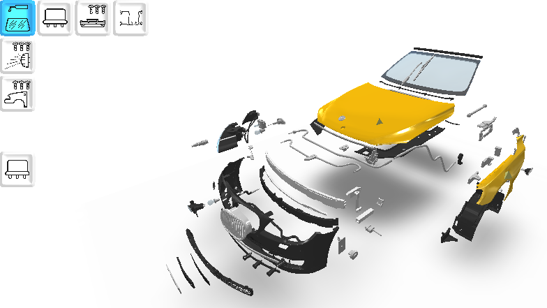 3D圖型顏色代碼可分成零件、材質、已點選零件,現在估價人員可以輕鬆視覺上區分類型,一旦選擇了受損部位,會將會呈現為橘色邊框,估價人員可以一覽全局,確保所有損壞的零件都被選定,同時材料顏色編碼有助於確保適當的修復技術。